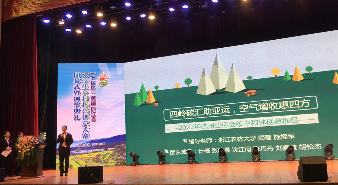 我校共組織27支隊伍參賽,其中有10支進入最后決賽。經過激烈角逐,共獲得6項金獎、4項銀獎、8項銅獎、3個單項獎以及優秀組織獎,金獎數量在全省高校中排名第一。其中,我校顧蕾老師指導計薇團隊編制和提交的“四嶺碳匯助亞運,空氣增收惠四方—2022年杭州亞運會碳中和林創意項目”,榮獲招標村產業創意類項目第一名,并參加了現場公開路演,展示了我校學子的風采。