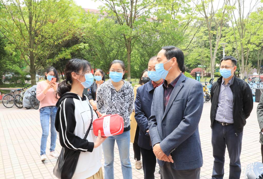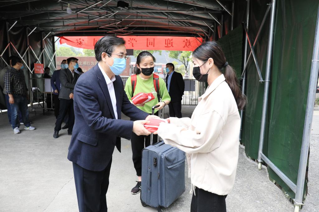 本批返校學生以疫情防控工作學生志愿者為主。校領導與前來報到的學生親切交流,關切地詢問了他們的返校行程,向學生贈送“志愿者健康包”,對他們的奉獻精神表示鼓勵,叮囑他們在志愿服務中加強個人防護,師生同心協力完成工作。