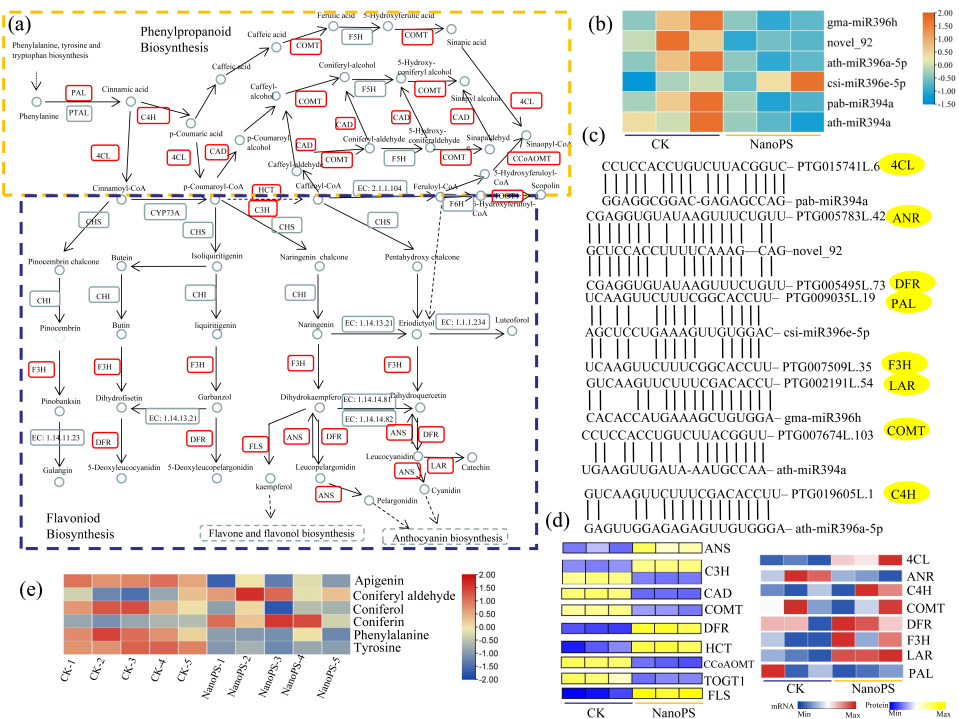 該研究揭示了直徑為100nm的聚苯乙烯納米塑料對香榧幼苗的生理生化和分子水平的反應。納米塑料促進了硫代巴比妥酸反應物質等的積累,誘導了過氧化氫酶和過氧化物酶等抗氧化酶活性。納米塑料影響了香榧光合作用,降低鐵、硫、鋅等元素的體內含量,大量差異代謝物被非靶向代謝組學鑒定。納米塑料的處理對香榧一系列化學和遺傳因子產生重要影響,包括抗氧化劑、小RNA、基因轉錄、蛋白表達和代謝物的積累。多組學聯合分析表明納米塑料在小RNA、轉錄、蛋白和代謝水平影響了香榧萜烯類和類黃酮生物合成途徑。