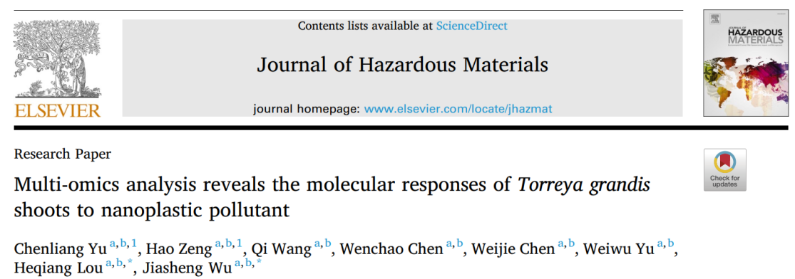 近日,國家重點實驗室特色干果團隊(吳家勝教授團隊)在國際TOP期刊《Journal of Hazardous Materials(危險材料雜志)》(IF=10.588)發表了題為“Multi-omics analysis reveals the molecular responses ofTorreya grandisshoots to nanoplastic pollutant(多組學分析揭示香榧幼苗對納米塑料污染物的分子響應)”的研究論文。該研究利用多組學聯合分析研究了香榧對納米塑料的反應,揭示萜烯類和類黃酮的生物合成在轉錄、蛋白和代謝等不同水平受納米塑料的影響,為森林植物對納米塑料的反應提供了新的見解。