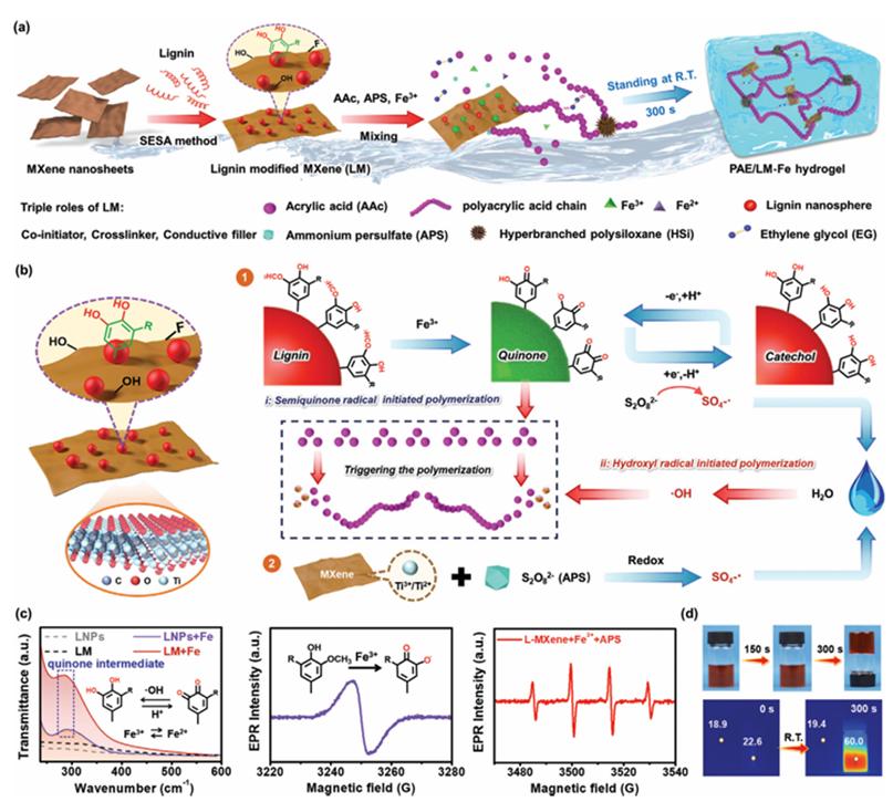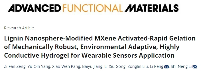 近日,化材學(xué)院林業(yè)工程學(xué)科生物基軟材料與阻燃功能材料團(tuán)隊(duì)以“Lignin Nanosphere-Modified MXene Activated-Rapid Gelation of Mechanically Robust, Environmental Adaptive, Highly Conductive Hydrogel for Wearable Sensors Application”(《基于木質(zhì)素納米球修飾MXene的力學(xué)強(qiáng)韌、環(huán)境自適應(yīng)、高導(dǎo)電水凝膠的快速凝膠化及其可穿戴傳感器應(yīng)用》)為題發(fā)表在工程技術(shù)領(lǐng)域國(guó)際期刊《Advanced Functional Materials》上(中科院1區(qū)TOP,IF=18.5)。論文第一作者為團(tuán)隊(duì)碩士畢業(yè)生曾子凡,青年教師厲世能博士為論文通訊作者,合作通訊作者為中科院物理所/長(zhǎng)三角物理研究中心的彭蠡副研究員。浙江農(nóng)林大學(xué)化學(xué)與材料工程學(xué)院為該論文第一單位和通訊作者單位。