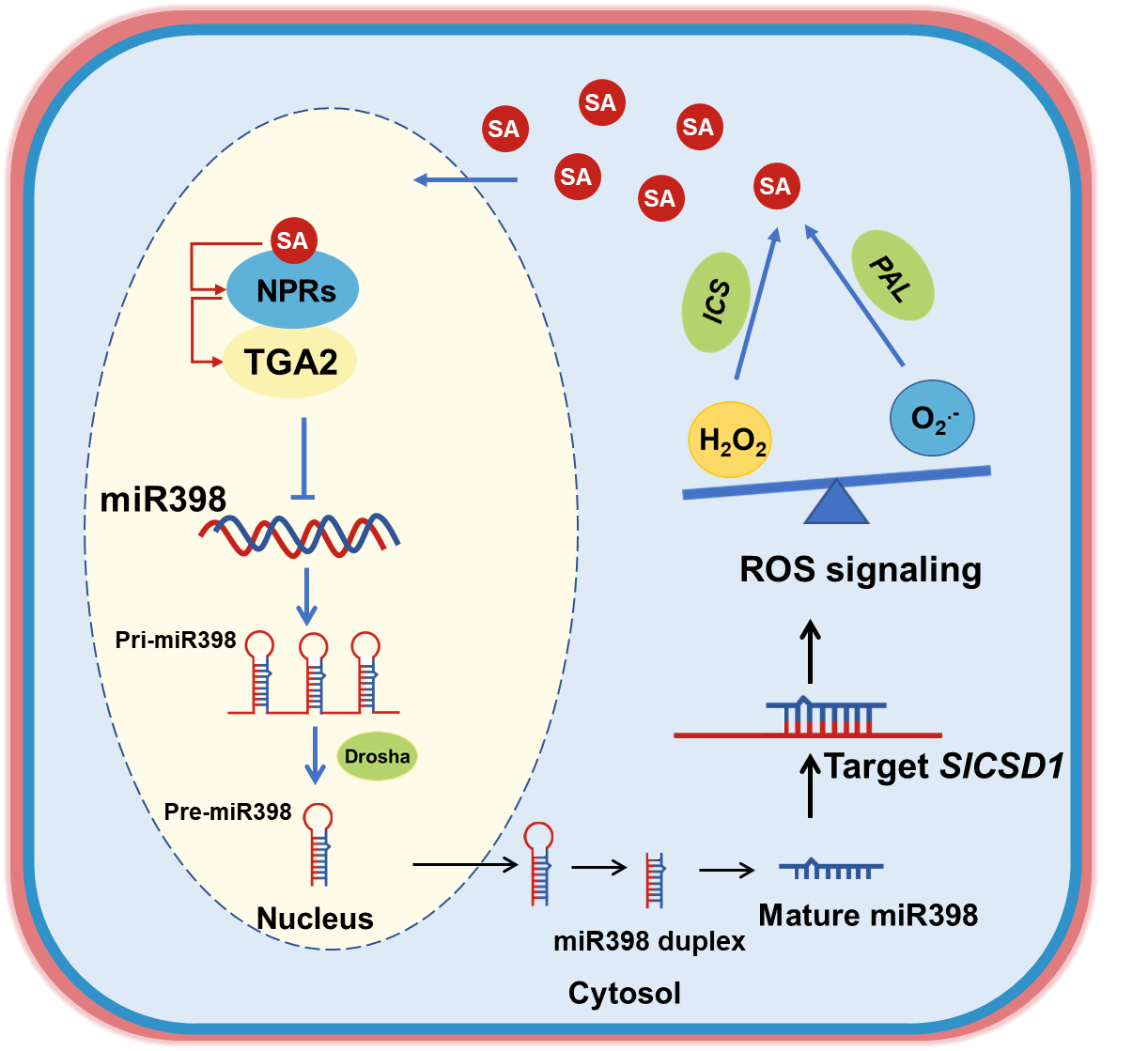 水楊酸(Salicylic Acid, SA)在高等植物的免疫應答信號轉導中起著至關重要的作用,它可與活性氧互相促進,形成正反饋環,放大抗性信號,但其作用機制尚不明確。該研究發現,低濃度SA處理番茄葉片后,超氧陰離子自由基O2.-生成速率降低,H2O2含量提高,超氧化物歧化酶活性以及編碼該蛋白的CSD1表達量上調,靶向CSD1的sly-miR398表達量下調;抑制內源SA積累的NahG轉基因植株其活性氧產生、sly-miR398和CSD1表達呈現相反趨勢。敲除CSD1后,SA對H2O2的促進作用部分消除。凝膠遷移實驗和雙熒光素酶實驗證實番茄轉錄因子TGA2可以與sly-miR398b啟動子互作,并抑制其活性。過表達和敲除sly-miR398b分別通過誘導丙氨酸解氨酶途徑和異分支酸合成酶途徑促進SA的合成。這些結果表明miR398-SlCSD1模塊在SA-H2O2信號放大過程中起到中間體的作用。