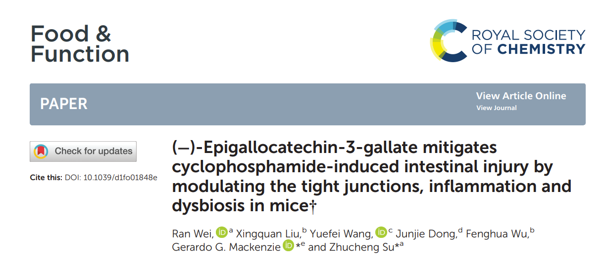 近日,茶學團隊教師魏然博士在國際知名學術期刊Food & Function (IF=5.396,一區TOP) 發表了題為"(?)-Epigallocatechin-3-gallate mitigates cyclophosphamide-induced intestinal injury by modulating the tight junctions, inflammation and dysbiosis in mice"的研究論文。研究揭示了茶(Camellia sinensis)活性組分表沒食子兒茶素沒食子酸酯(epigallocatechin-3-gallate, EGCG)可有效改善由化療藥物環磷酰胺(cyclophosphamide, CTX)引發的腸道毒性,為將茶天然產物進一步應用于人體保健提供了重要的理論依據。