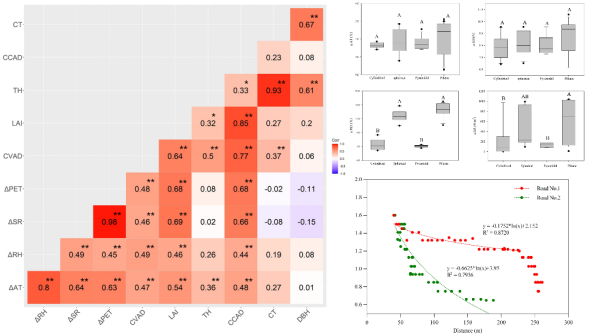 近日,國家重點實驗室森林碳匯研究團隊(周國模教授團隊)在《Agricultural and Forest Meteorology》(中科院1區,IF=5.734)發表題為“Effect of the roadside tree canopy structure and the surrounding on thedaytime urban air temperature in summer”的研究論文。本研究創新性的結合無線傳感和激光雷達技術,篩選出行道樹冠層3D結構的主要參數,量化了行道樹冠層3D結構對城市道路夏季降溫增濕和人體舒適度的影響,并通過空間分析和距離分析量化了周圍環境的影響,為城市行道樹樹種選擇和空間布局提供了科學依據。