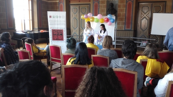 同日,在卡爾洛芙茲(Karlovci )語言高中漢語教學點,孔院老師和志愿者們為中專業的50多名師生組織了精彩紛呈的“妙語極茗”文化串燒活動。視頻和畫猜互動的巧妙運用,成語“畫蛇添足”的風趣講解;師生雙人茶藝“西湖雙絕”及二十四式太極的一招一式等等都燃起了學生們對中國文化的濃厚興趣。